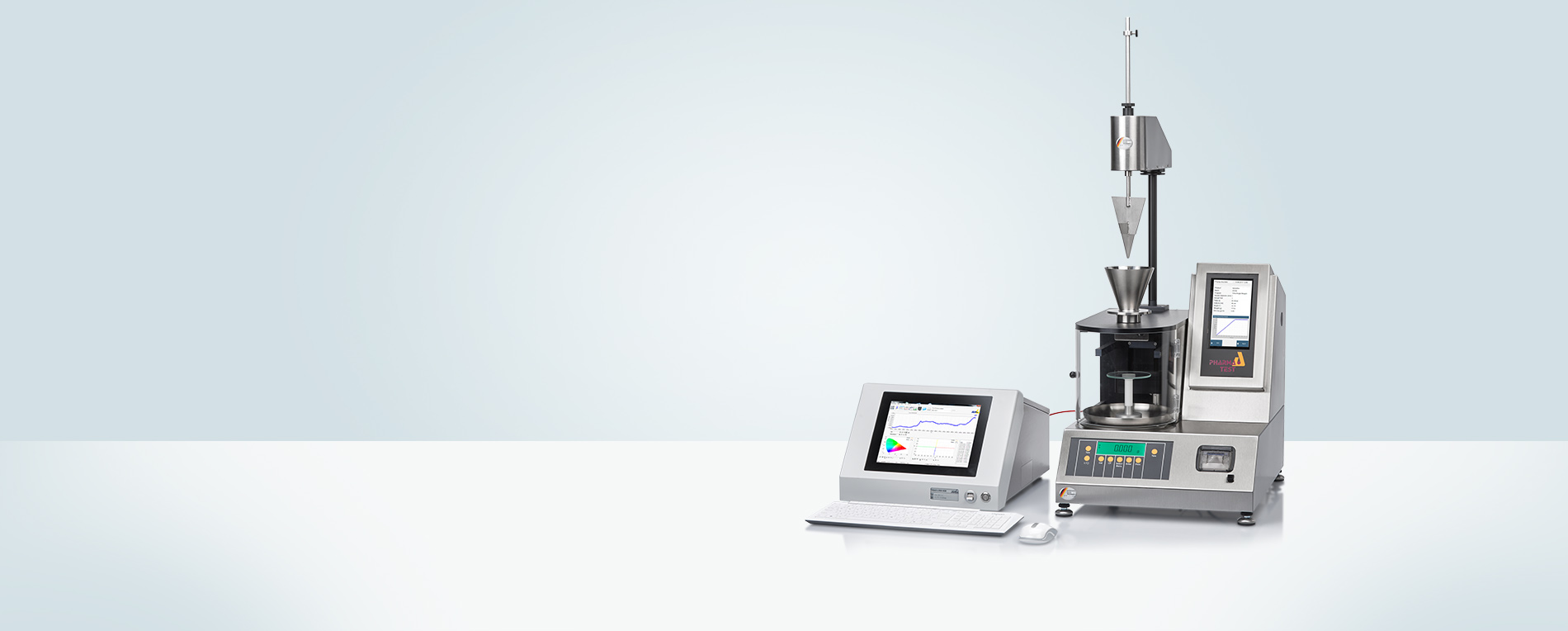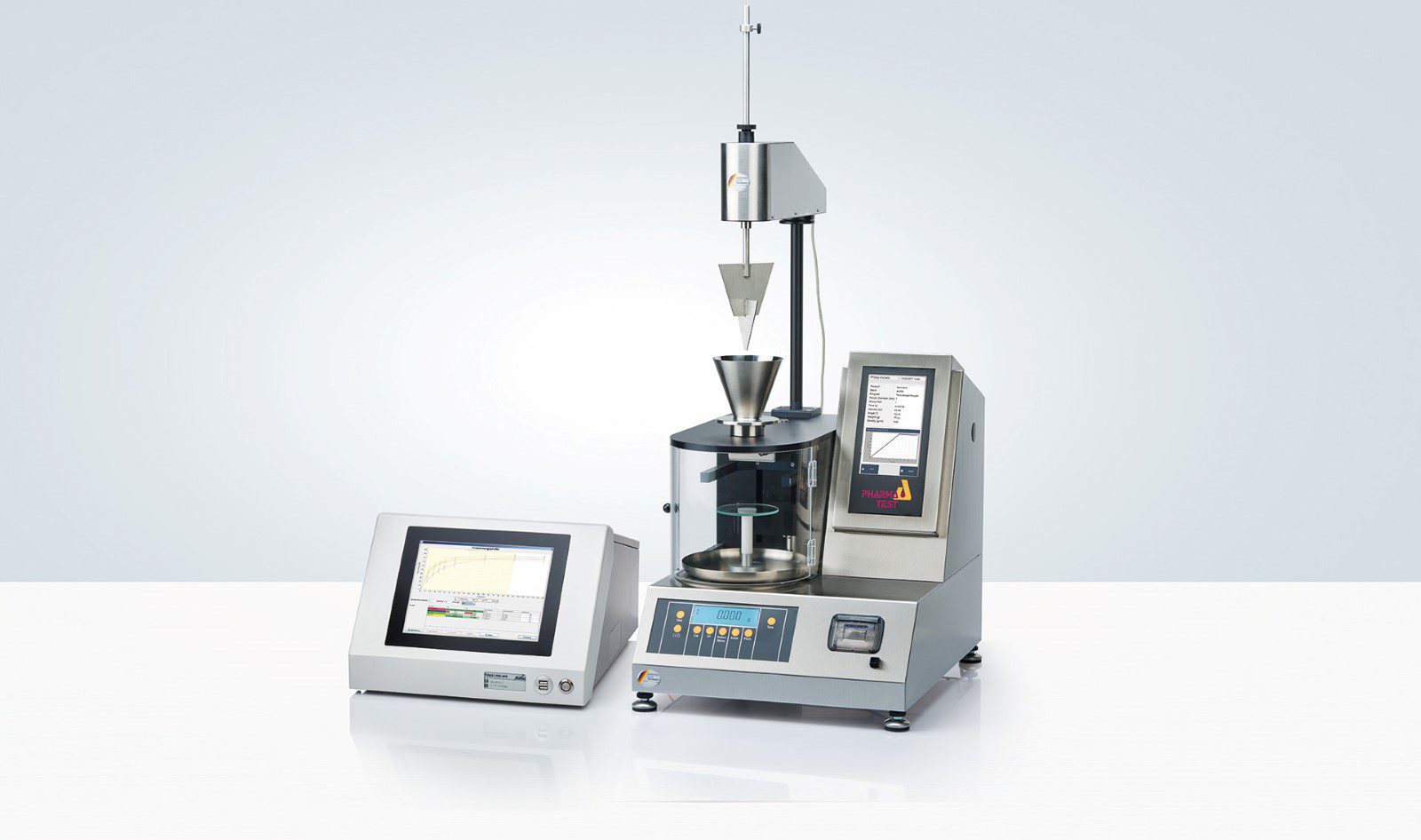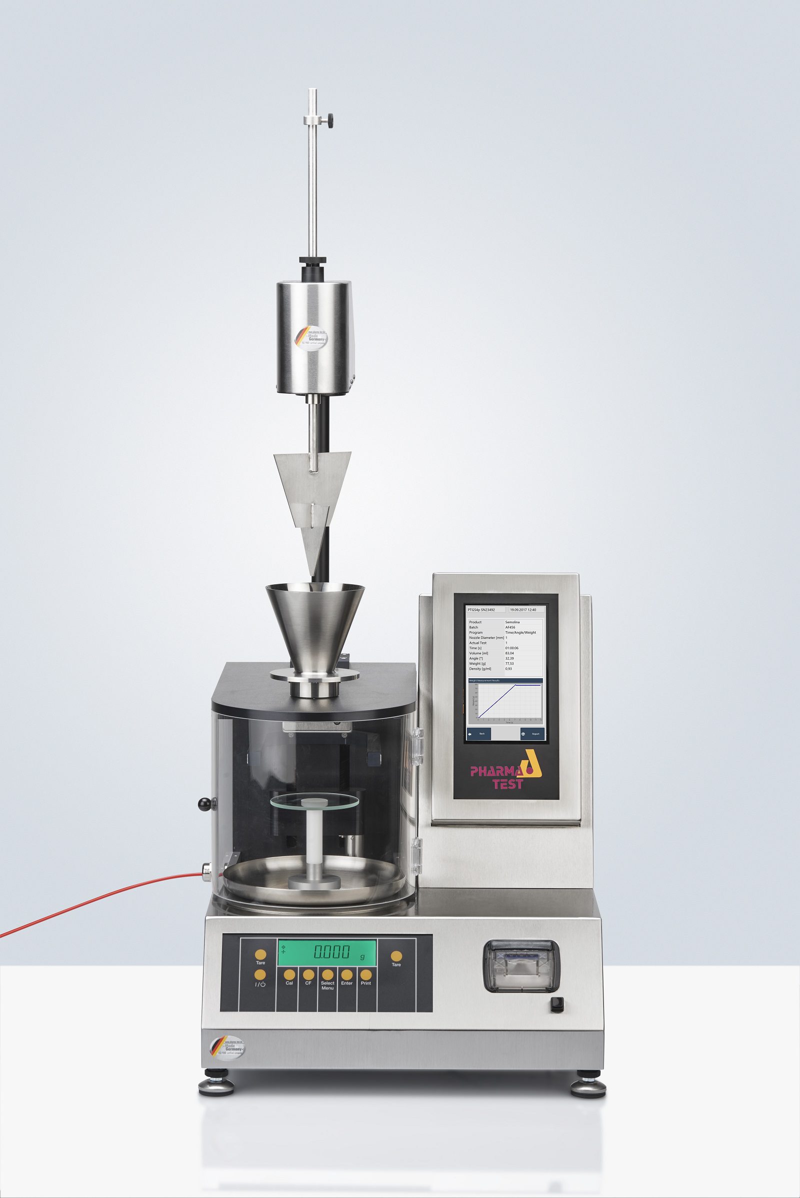 A conical funnel, which can be equipped with different pouring nozzles, takes the sample to be tested. A built-in analytical Sartorius balance cell takes the product collecting dish. The PTG-ER electrical stirrer may be used for powders, which do not flow well. Most pharmaceutical material contains such a high amount of fine particles that it will not start to flow without assistance.