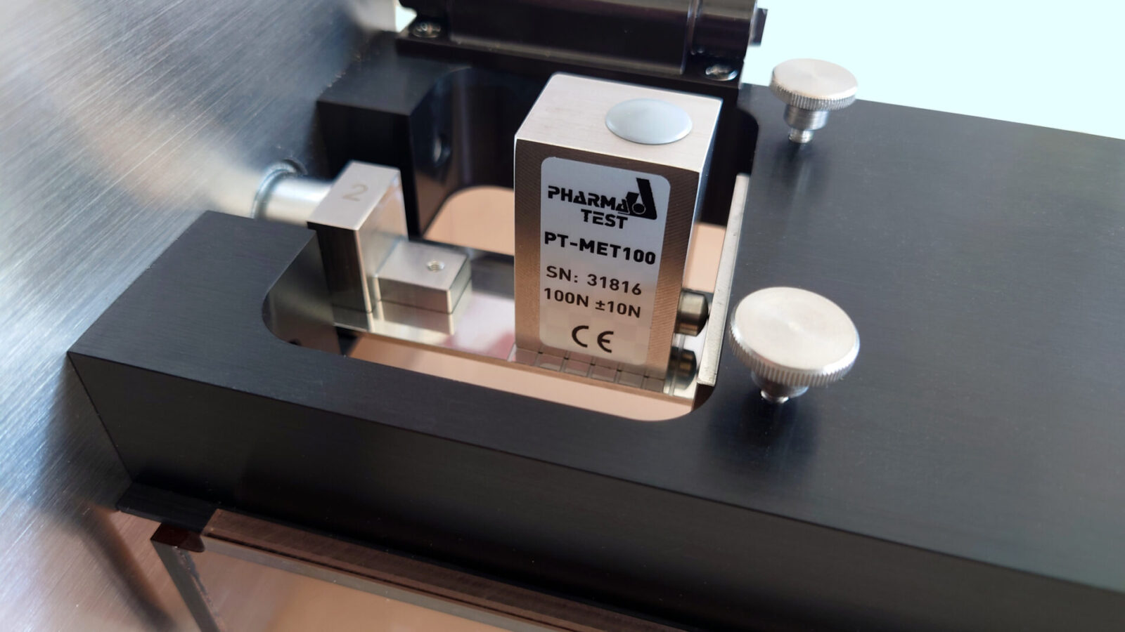 Quickly check the hardness measuring station of your Pharma Test PTB tablet hardness testers (or other vendor's units) for correct operation at the beginning of each shift or day. Sometimes referred to as a "mechanical tablet", our PT-MET set functions as a checking device which is used to simulate the breaking of a tablet at defined conditions.