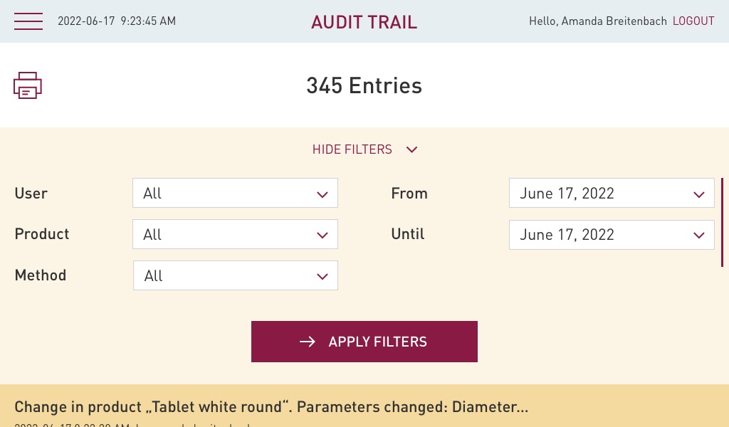 PTB 500 features and audit trail that all events according to 21 CFR Part 11 requirements. The events can be displayed on the instrument itself and be printed for examples as PDF for documentation purposes. The events of the audit trail can be filtered by user, product, method and date of the event. For each event a detailed description is available with mention of the related user, method and product and which value has been changed from what to what.