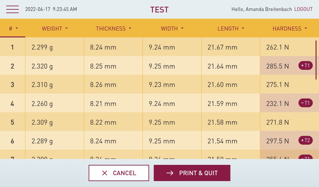 The on-screen menu will lead the user through the test at all times. The five results are immediately displayed and can be printed directly or transferred to a LIMS system. The results are saved to the internal database of the instrument and can be always reviewed. When printing via either a printer directly connected by USB or a network printer three options are available: print the data including each individual result as well as product information, date, time, user, instrument serial number, statistics can be added to this information of just print the breaking curve of the last broken tablet.