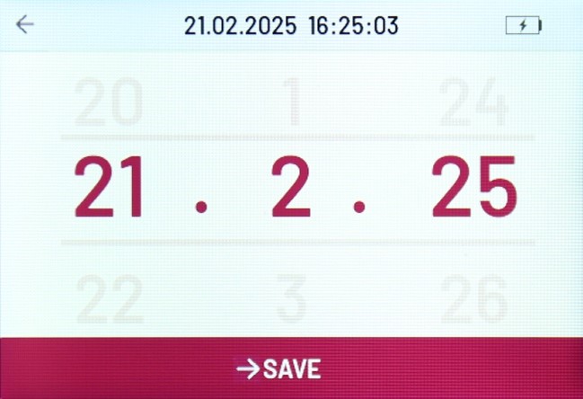 The settings menu is password protected. This password can be changed. The instrument keeps date and time (date and time are not lost when the battery is empty) and supports 12- and 24-hour time formats and US and European date formats. All printouts contain date and time of performance and date and time of the printing.