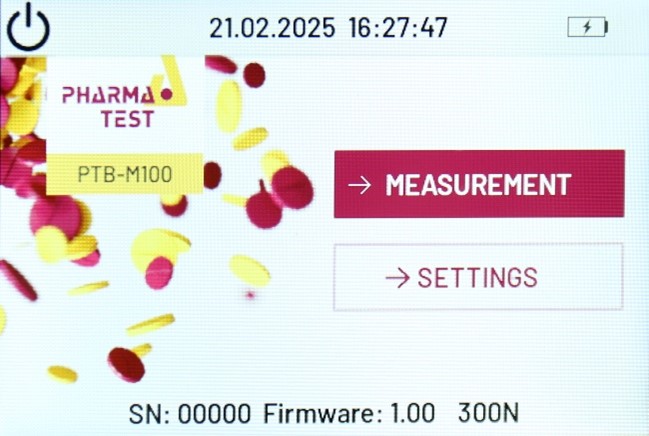The instrument is operated using a 3.5” color touch screen. During a test the hardness value is displayed live in either Newton (N), Kilopond (Kp) or StrongCobb (Sc). The instrument is powered by a rechargeable battery using a standard USB-C charger. The test results can be documented by connecting a ticket printer or by using the Pharma Test PT-Node network adapter. When starting a new test run, a batch number (alpha-numeric) can be entered using a software keyboard.